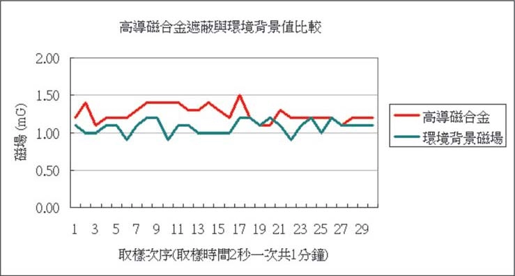 高導磁合金遮蔽與環境背景值比較數據相當,表示干擾磁場已經被完全隔離。